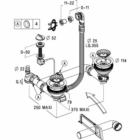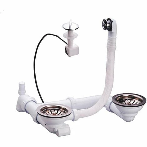 - Vidage à panier Ø114mm pour tout type d’éviers 2 bacs de perçage Ø90mm, à commande automatique rotative sur 1 bac, avec trop plein, tubulure gain d’espace et prise machine à laver.